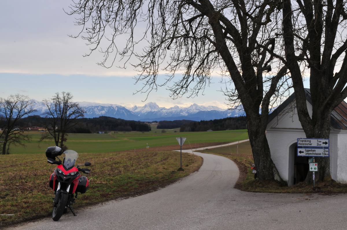 Bei Rohrdorf unterqueren wir die vielbefahrene Autobahn und freuen uns darüber, dass wir auf unserer Route deutlich weniger Verkehr, dafür aber ebenso deutlich mehr kurviges Geläuf zu erwarten haben. Und das führt uns jetzt wunderschön durch Wald und Wiesen bergauf. Bei Steinkirchen haben wir den Höhenrücken erklommen und fahren weiter in Richtung Obereck. Hier ist ein kurzer Stopp schon fast ein Muss! Von dem bekannten Aussichtspunkt oberhalb von Törwang hat man tatsächlich einen phantastischen Blick über Chiemsee und Simssee und zur anderen Richtung der Autobahn folgend bis nach München, wo sich bei passendem Wetter der Fernsehturm gut ausmachen lässt.