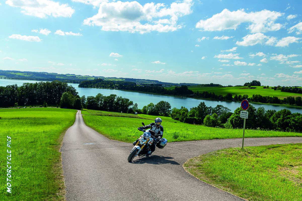 Wir entscheiden uns gegen beide Möglichkeiten und geben uns stattdessen weiter ganz und gar dem zweirädrigen Kurvenvergnügen hin. Und das kommt auf der weiteren Strecke über Höslwang und Hemhof nicht zu kurz. Wir tauchen ein in dichten Wald, der uns auf engen, geschwungenen Pfaden nach Rimsting führt. Hier geht’s ab Richtung Ratzinger Höhe und wir können auf dem Weg traumhafte Ausblicke und Fahrgenuss pur konsumieren. In Söllhuben lockt der Biergarten „Beim Hirzinger“, einem weithin bekannten Hotel und Gasthof, das seinen Bekanntheitsgrad vor allem den Fernsehaufzeichnungen der BR-Serie „Wirtshausmusikanten bei Hirzinger“ verdankt. Wir überlegen uns, einen kurzen Stopp einzulegen, entscheiden uns aber dann doch dafür, lieber unsere eigene Lieblingsmusik mit den Bikes zu produzieren und geben weiter Gas.